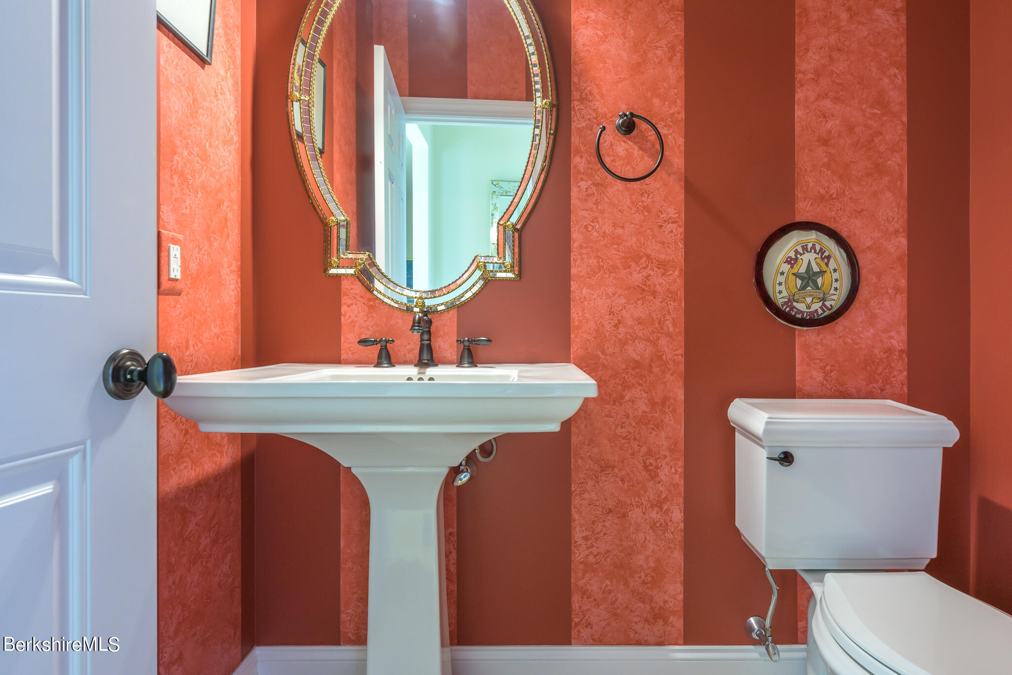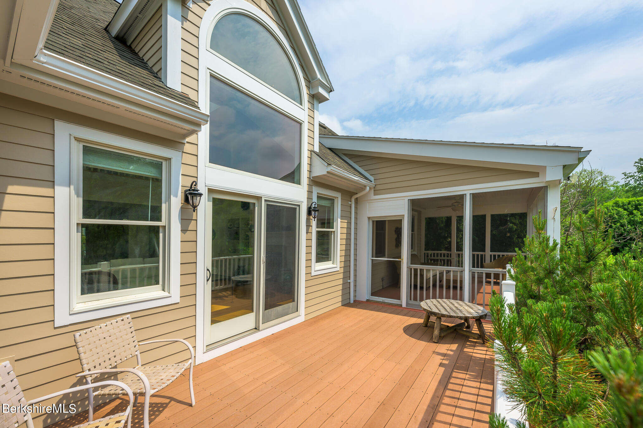 Located in a pretty country setting, this home offers an exceptional open floor plan, well thought out spaces, and a welcoming front porch with wrap around deck. Comfortable living room with a gas fireplace and vaulted ceiling, spacious first floor primary suite, a handsome library with built-in bookcases and a cheerful four season sunroom with steps to a private patio. The kitchen is the focal point and offers ample storage. On the second floor there are three bedrooms, two bathrooms, an exercise room or office space through one of the bedrooms and two distinct sitting areas. Terrific location - just 10 minutes to the main gate of Tanglewood and 5 minutes to the center of West Stockbridge. Protected common land across the way.
